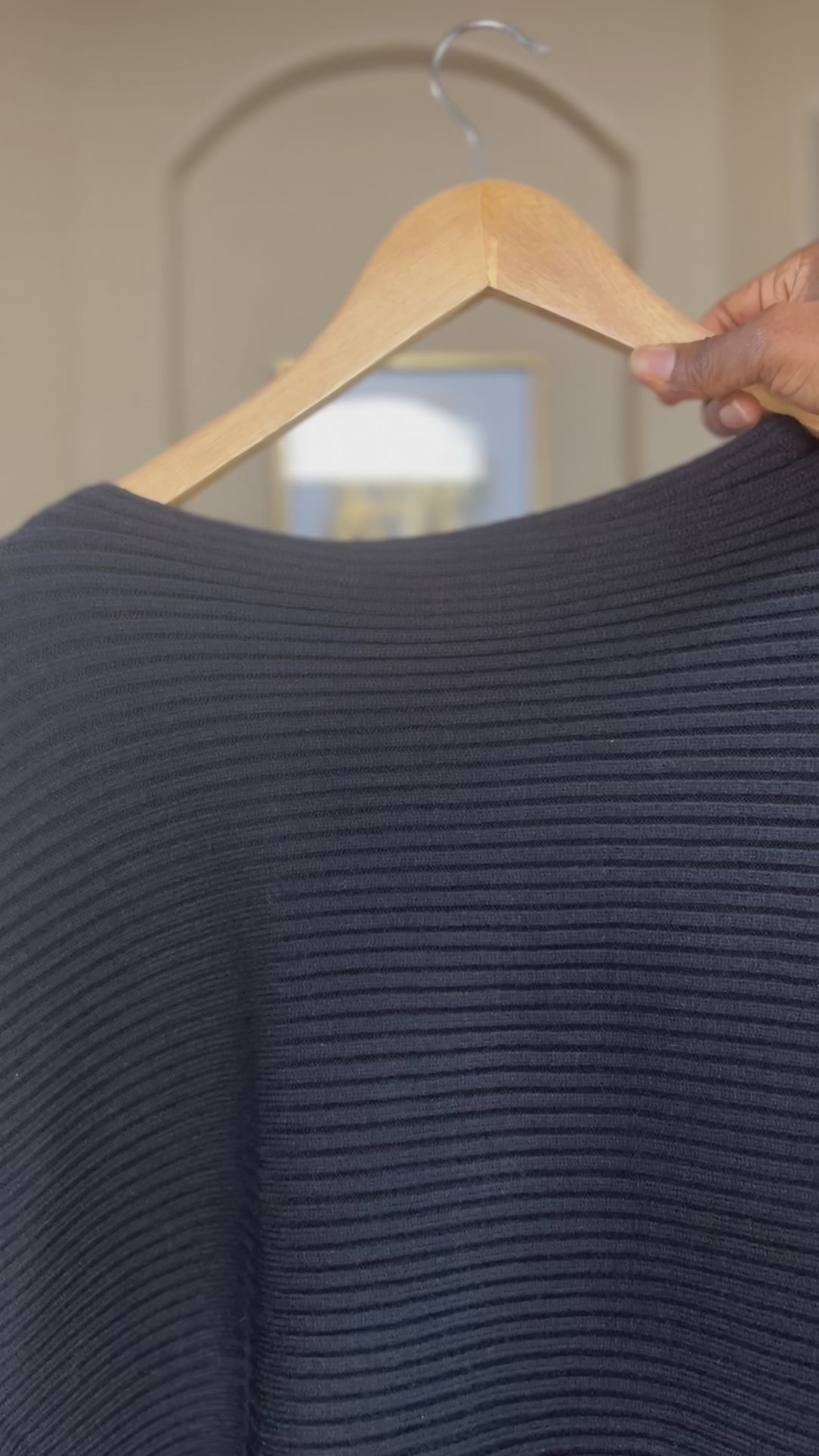This is your stylish alternative to a classic wool sweater. This dolman sleeve ribbed sweater features a boat neckline and a loose fit. The sleeves end with a narrow fit at the wrist. The fit makes it a perfect alternative to wear in the office and transition to an evening on the town in the cooler weather.